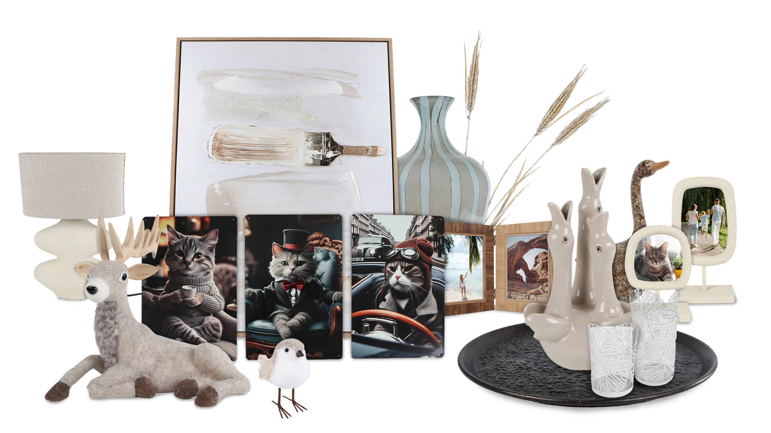 De collectie bestaat o.a. uit glaswerk, windlichten, dienbladen, klokken kleinmeubelen, kunstbloemen en andere (wand) decoratie en accessoires.